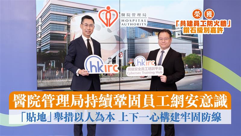 醫院管理局持續鞏固員工網安意識 榮獲「共建員工防火牆」鑽石級別嘉許 「貼地」舉措以人為本 上下一心構建牢固防線 (Chinese Only)